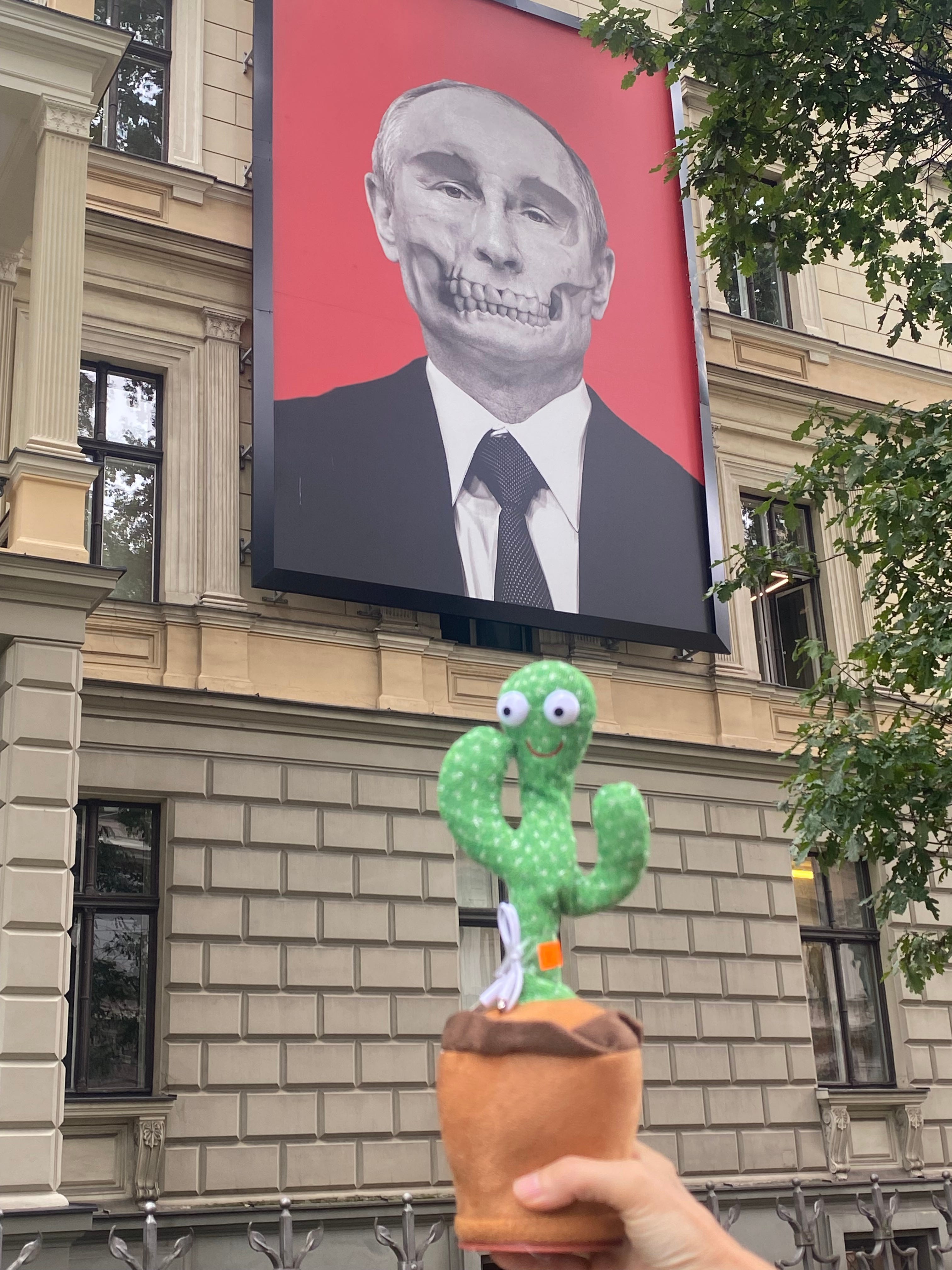 The cactus appears in Riga outside the Russian embassy—across from which a famous portrait of Vladimir Putin hangs.