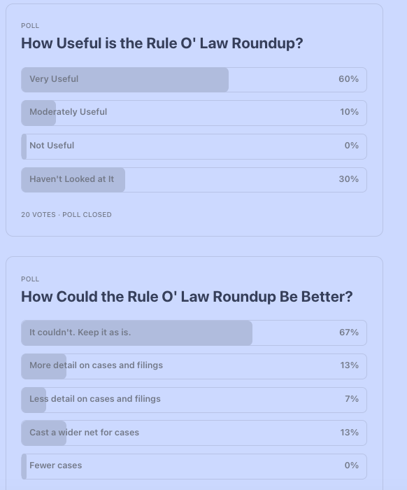 Interesting results from my poll on user reactions to the Rule O’ Law roundup. People seem generally pleased with it, though 30 percent of eligible users haven’t event looked at it yet: