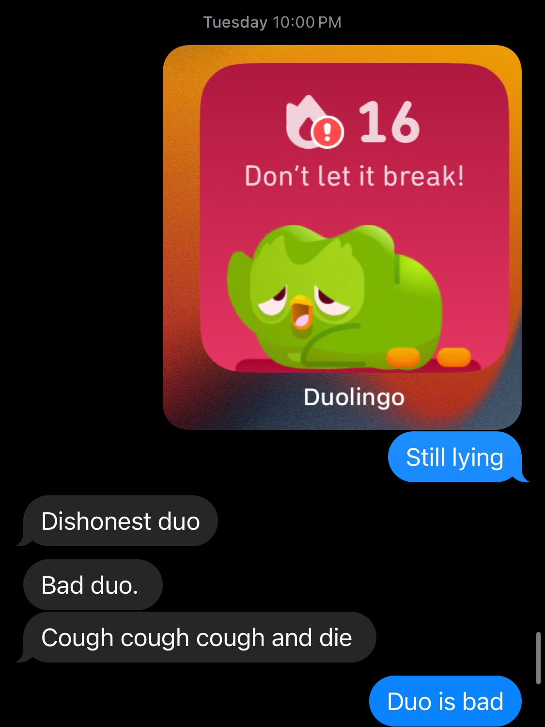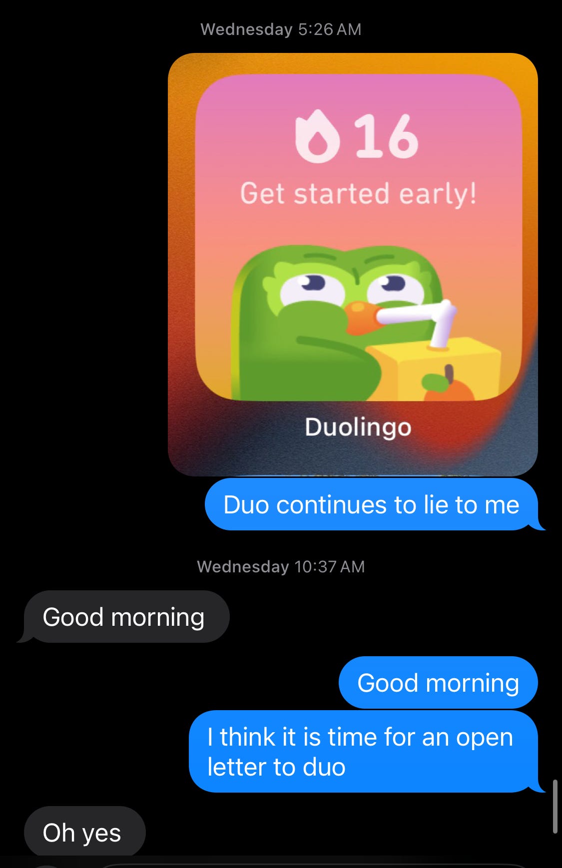 Duo, dude, yingele, green motherfucker that you are: I want an #HonestStreak option. It’s not too much to ask. I want a means of knowing how many days in a row I have actually practiced. No games. No indulgences. No tricks. (I will tolerate an exception for crossing the International Date Line, but that’s it). I don’t want credit for stuff I didn’t do. And I don’t want to have to take lengthy breaks from studying languages in order to force you to count accurately.