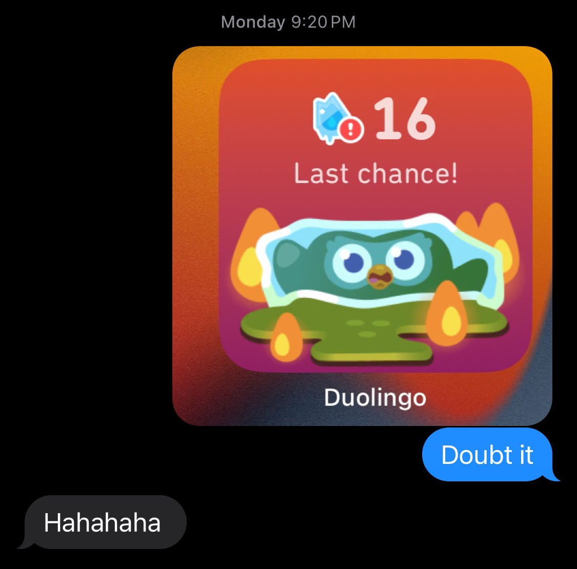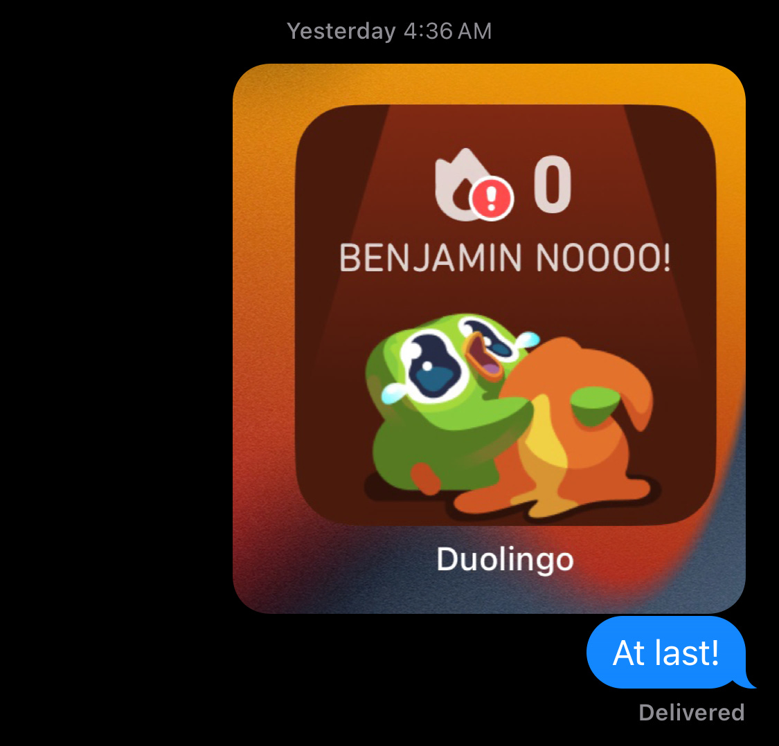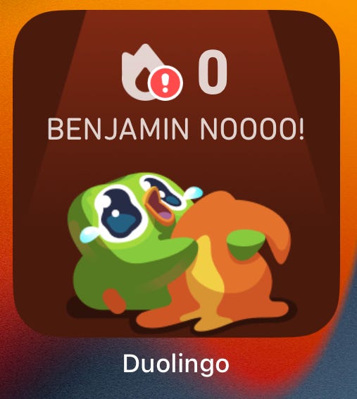 The second concept is the “streak.” You count every sequential day every user practices, and you dangle the threat of our streaks ending as part of the incentive to do at least one lesson every day. Again, it’s very clever. Nobody wants to lose a years-long streak, particularly as the app has this social component so that my “friends” can see my streak—and see it end. What’s more, you have created this powerful idea of friend streaks, wherein users and their social contacts practice in streaks together and thus have powerful incentives not to let their partners down by missing a day. Again, it’s fine. It works.