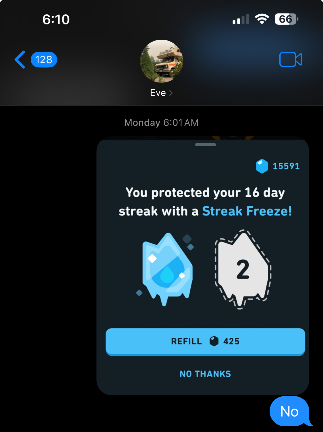 On Monday morning, you informed me that I had protected my streak, though you and I both know that I had done no such thing. You had protected my streak, because you are a liar. I texted Eve the evidence of your corrupt scheme: