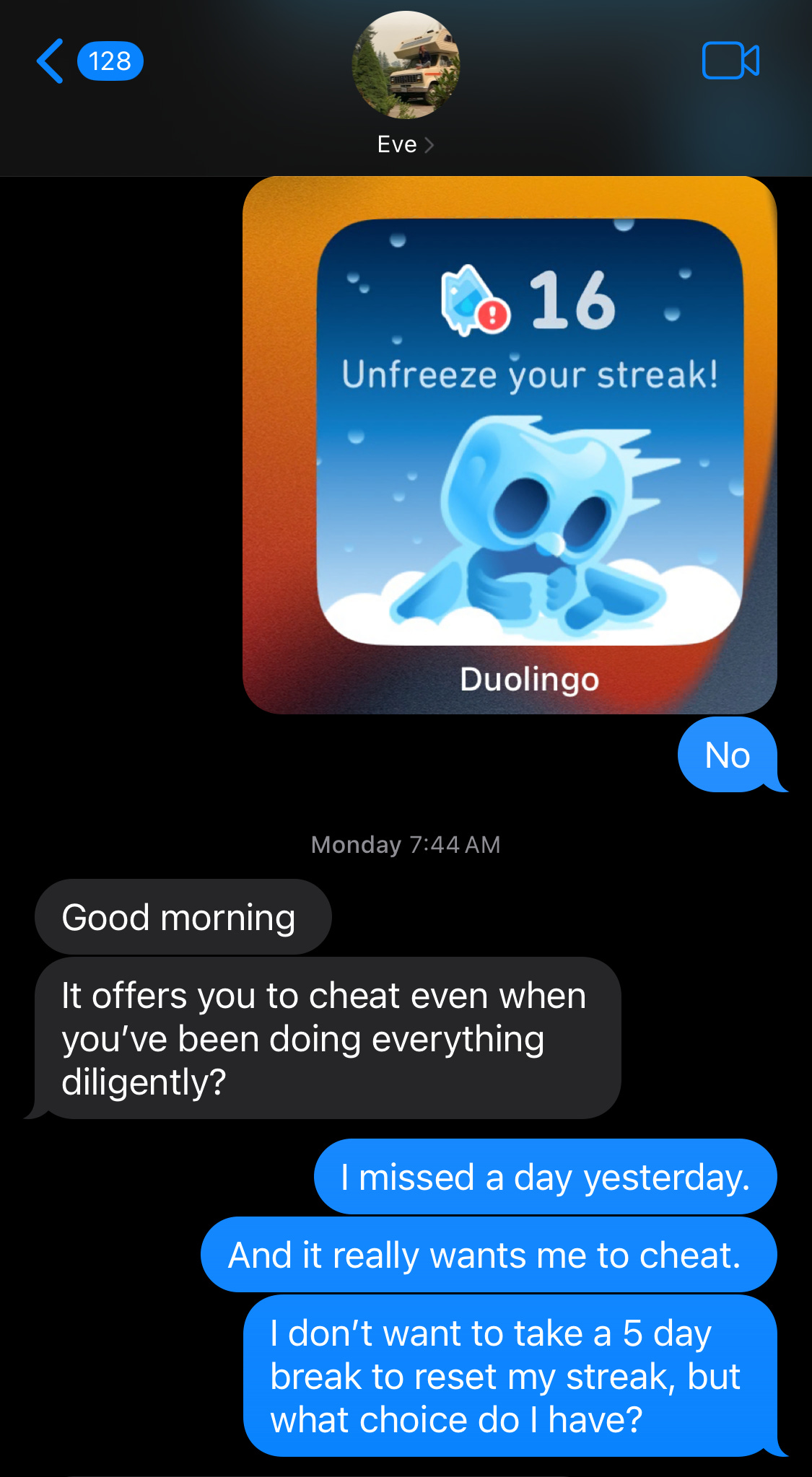 When my streak ended, I just wanted to start over, from Day 1, and have an #HonestStreak. You refused. For more than a week, you kept insisting that streak freezes had preserved my streak. You kept pretending that I had practiced hundreds of days in a row. I had to take a lengthy break from practicing my various languages merely to get the clock to reset to zero. I vowed that I would not allow you to lie to me any more.