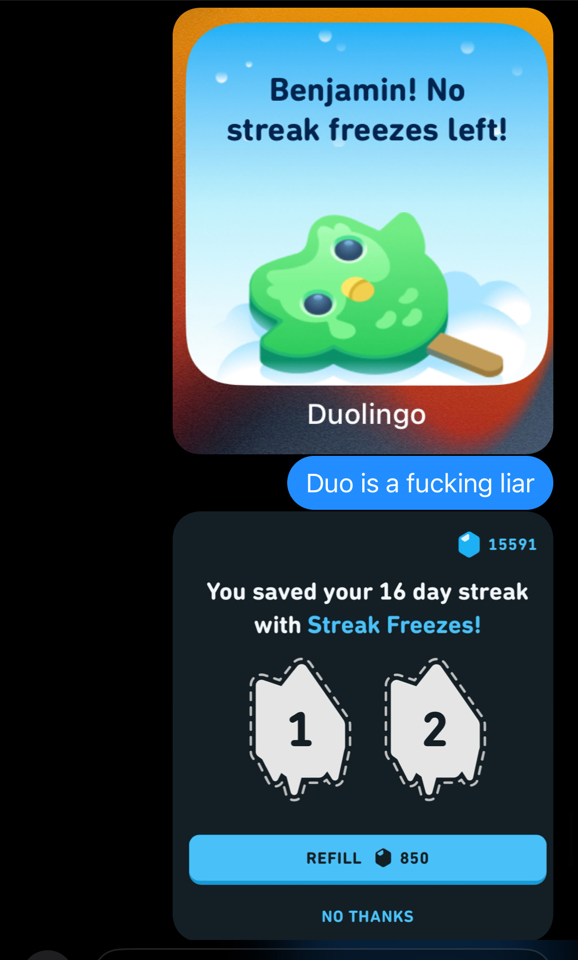 You immediately slapped a “streak freeze” on my streak. What is a streak freeze? It’s a kind of mulligan which you created so that when people don’t, in fact, practice every day, they can pretend that they did. What’s more, you sell these streak freezes in exchange for the “gems” earned by people who fall for your gamification stunt. People also “earn” streak freezes as prizes over time. Practice X number of days, and you’ll earn a few streak freezes to cover days you might miss. These streak freezes accrue quickly, so that it quickly becomes hard to fail your way out of a streak.