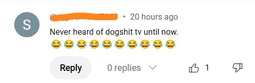 ’s favorite Dog Shirt TV comment of all time:Juvenile? Undeniably. But there is something truly elegant about a perfectly crafted juvenile pun. I note that I beat this punster to the pun by some time: