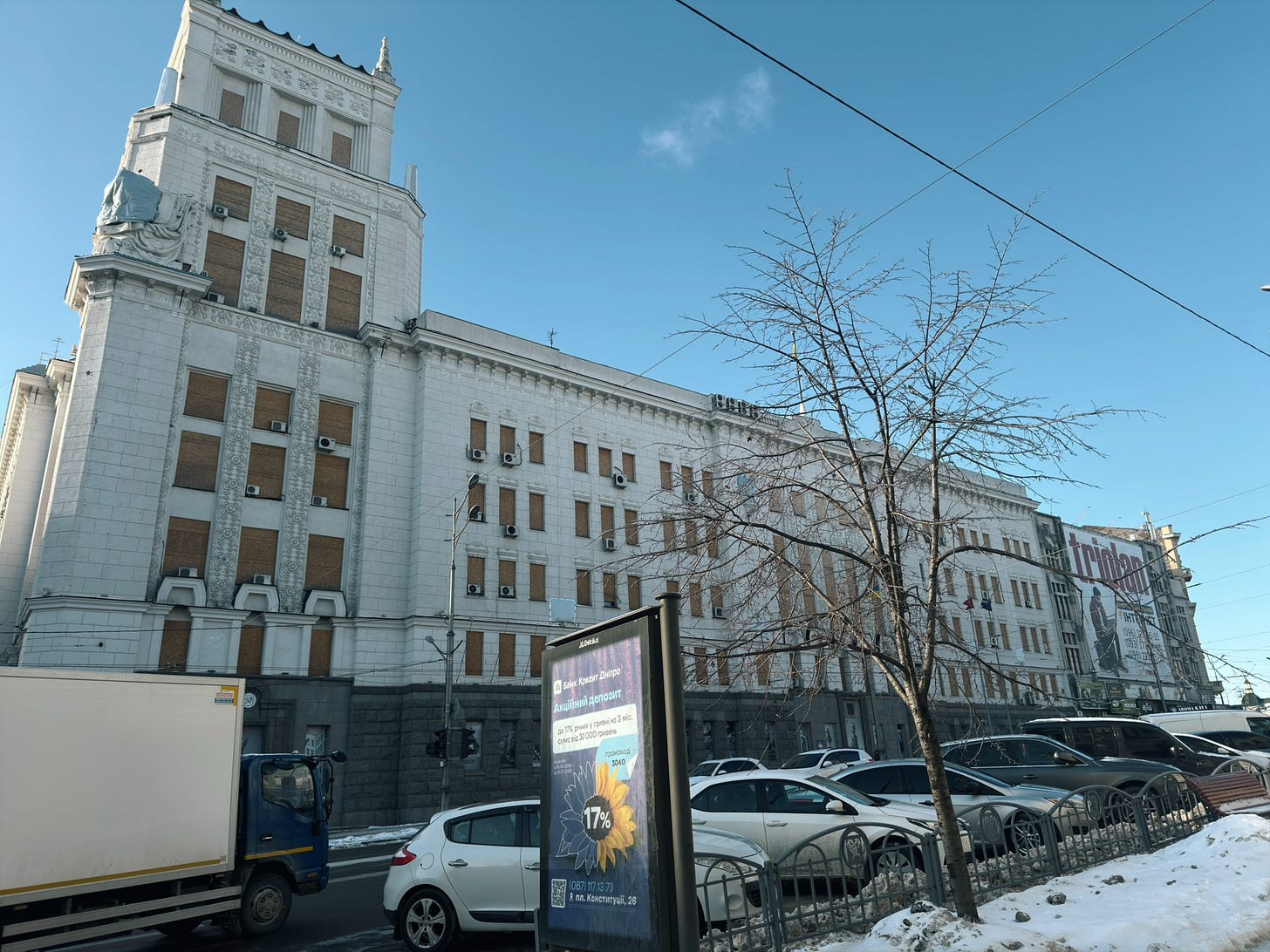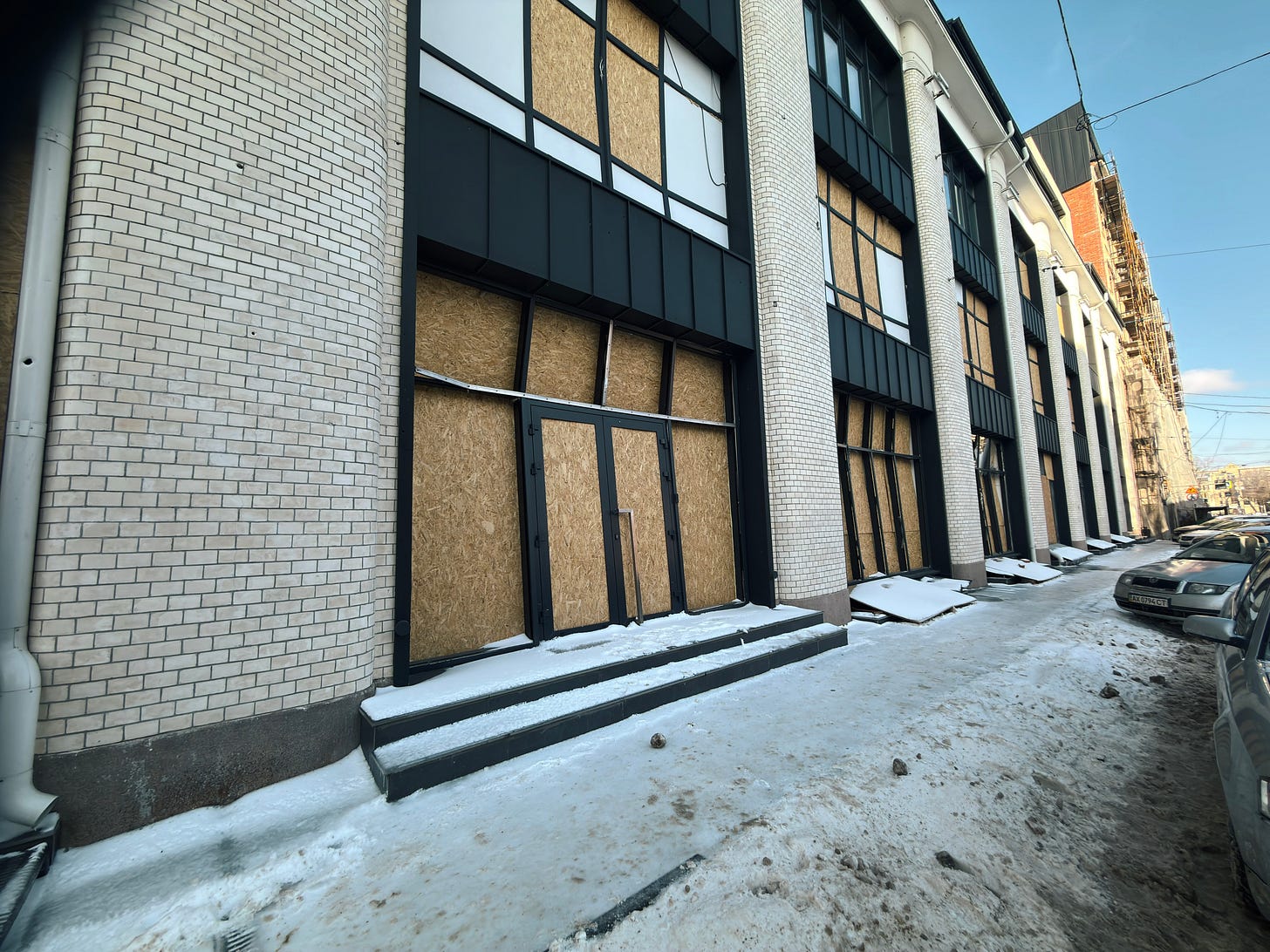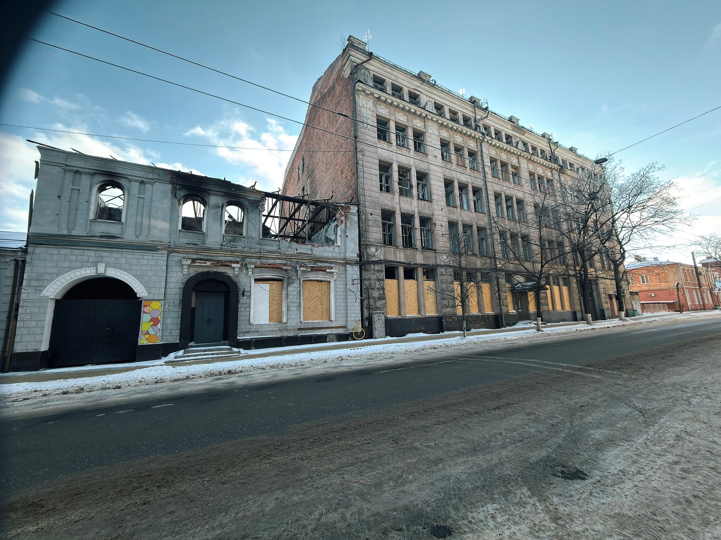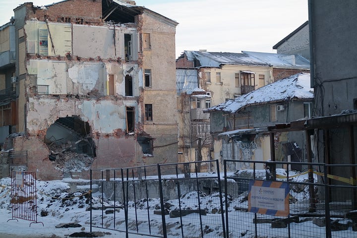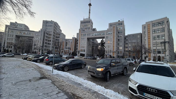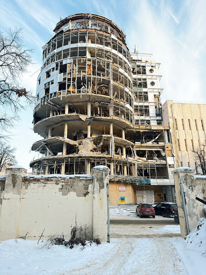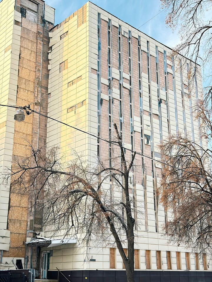 Indeed, Kharkiv is unlike Kyiv in that the percentage of downtown buildings that have some degree of damage can really overwhelm you. In Kyiv, the power situation and the heating situation are genuine disasters, and air attacks are a nightly affair; and there is no shortage of buildings that have been hit with drones or ballistic missiles. I don’t mean to dismiss the situation in Kyiv.