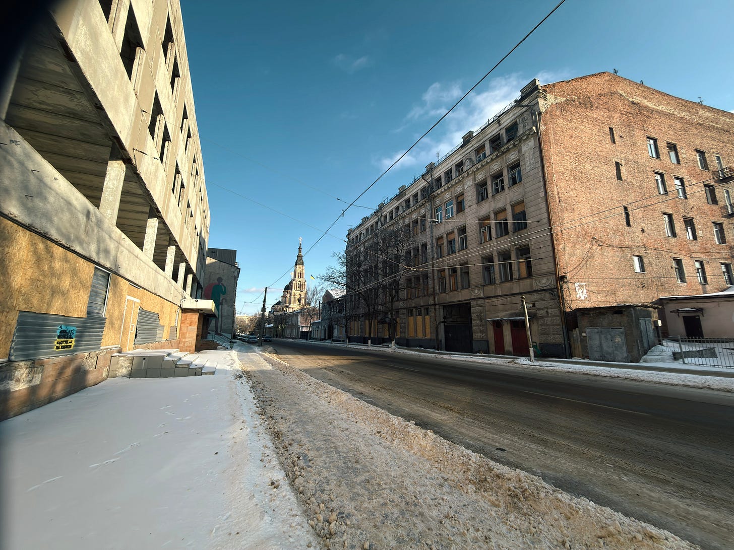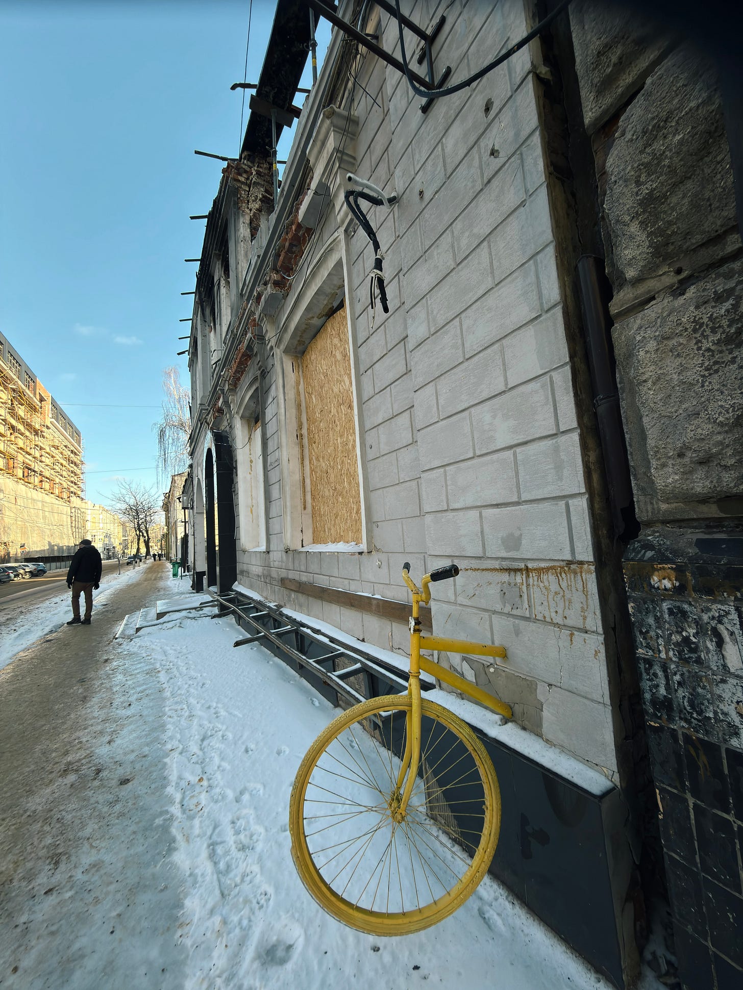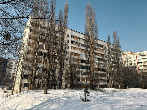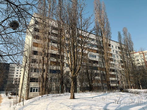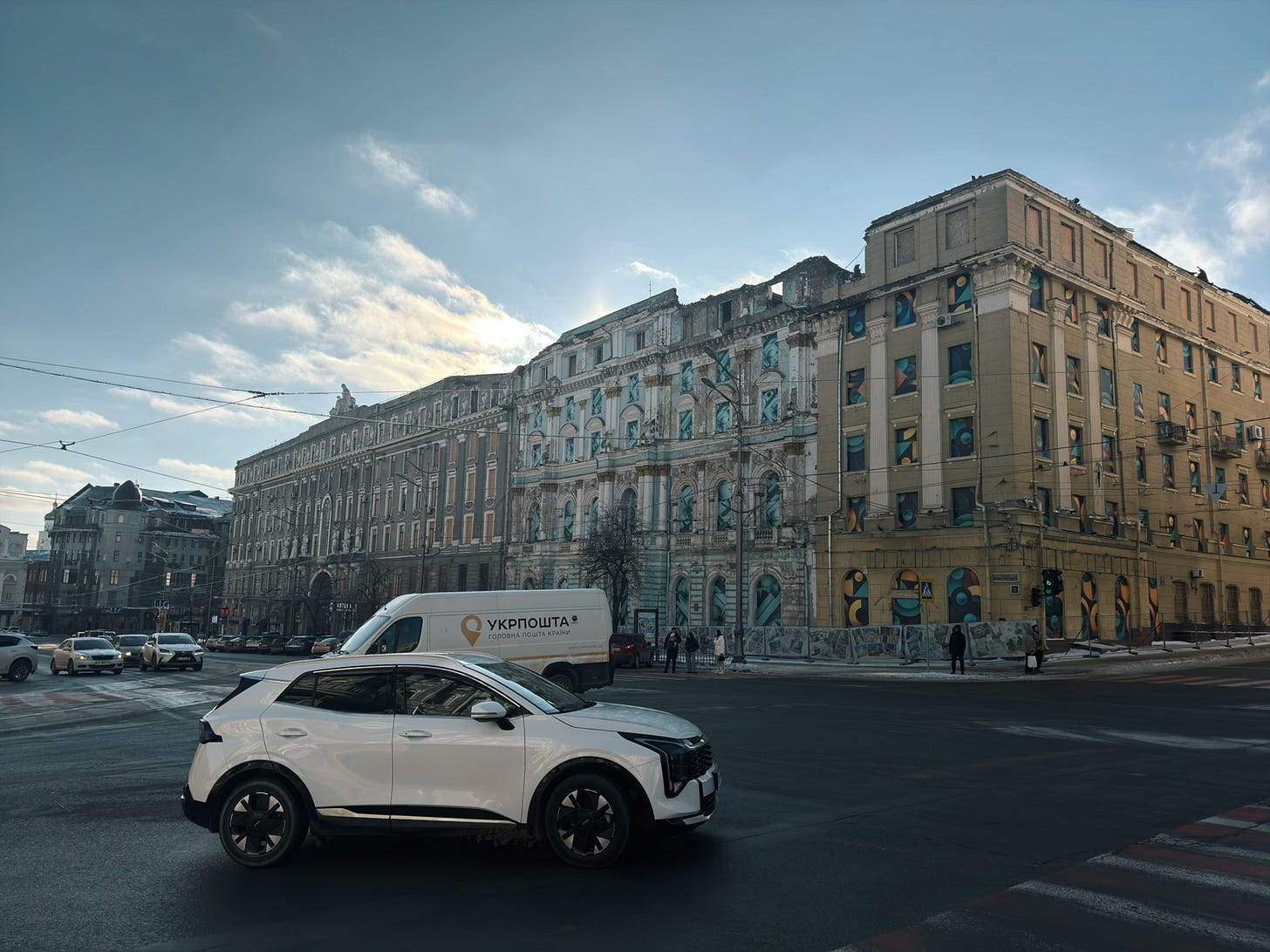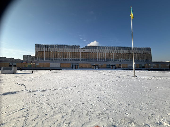 Indeed, Kharkiv is unlike Kyiv in that the percentage of downtown buildings that have some degree of damage can really overwhelm you. In Kyiv, the power situation and the heating situation are genuine disasters, and air attacks are a nightly affair; and there is no shortage of buildings that have been hit with drones or ballistic missiles. I don’t mean to dismiss the situation in Kyiv.