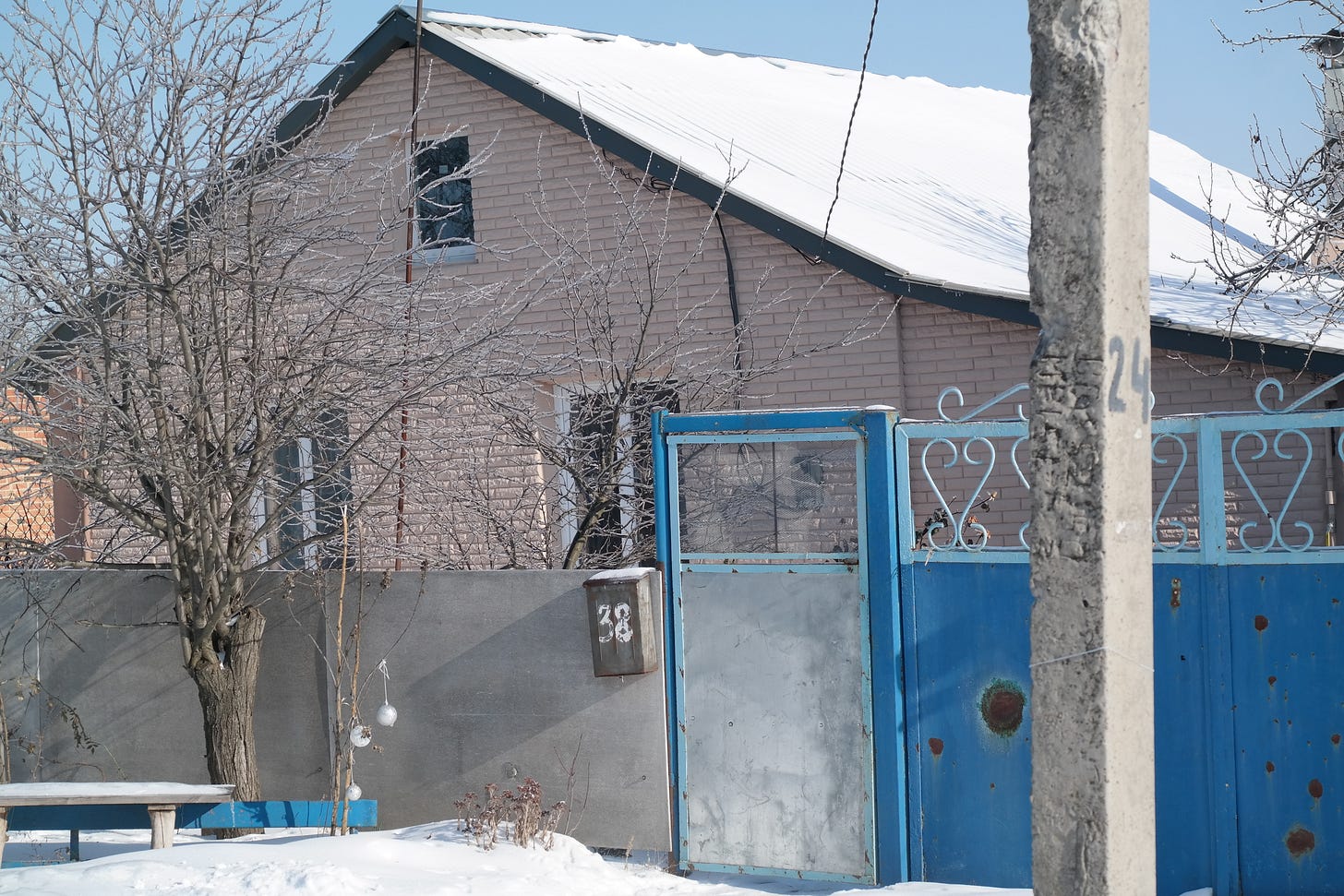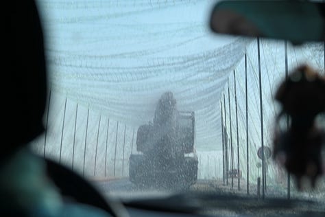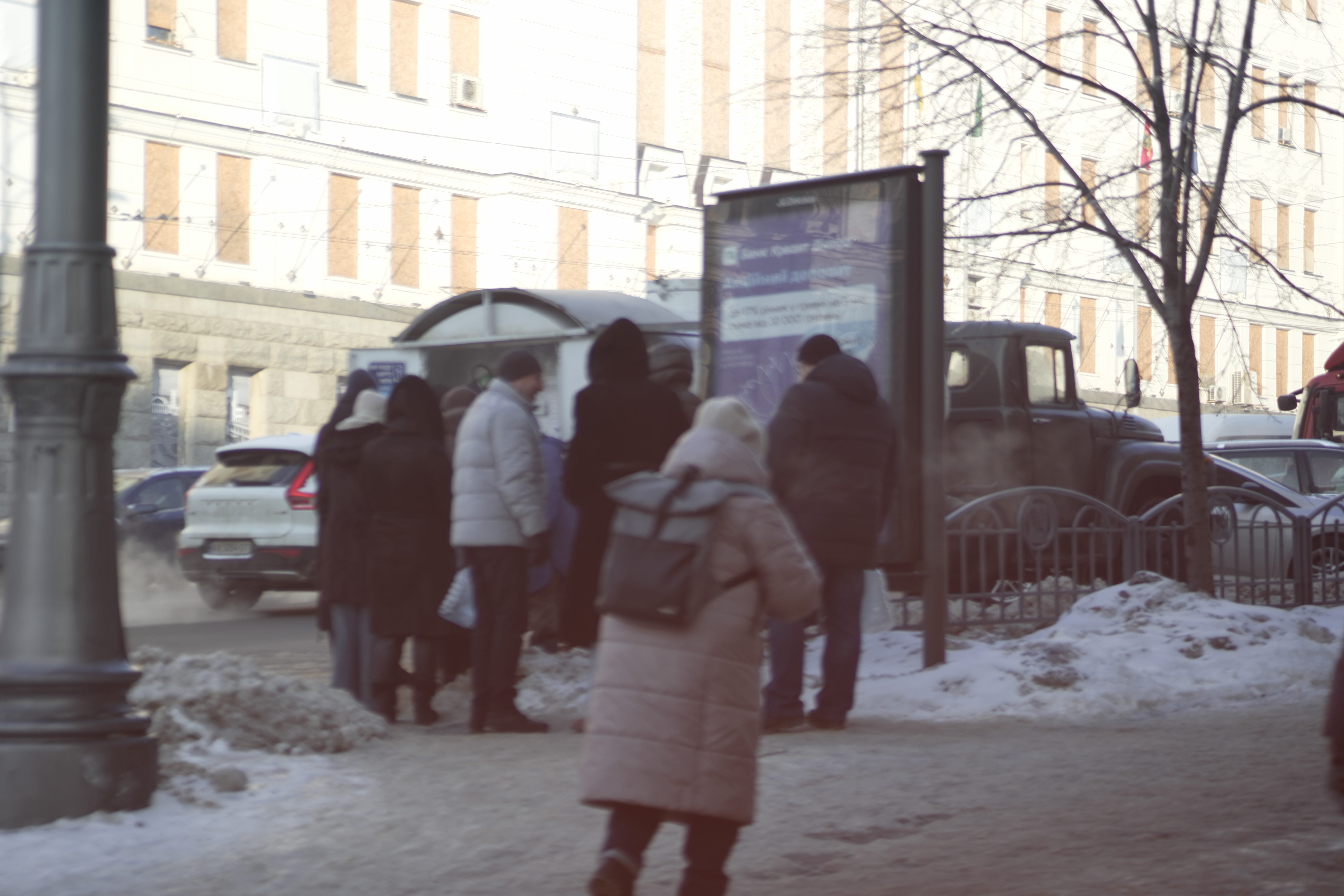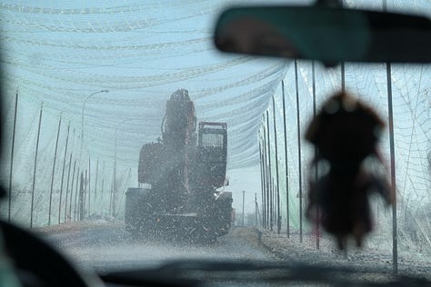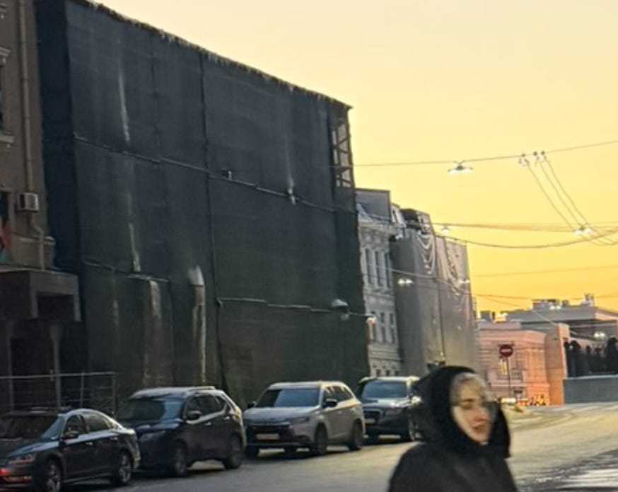 Such defensive measures—public and private, simple and elaborate—are all over the place. The military has placed anti-drone netting over swaths of the ring road which encircles the city. While we were driving a lengthy stretch of this covered road, a truck in front of us carrying earth-moving equipment discovered the hard way that it was too tall. It began scraping the netting as it passed underneath, causing large amounts of ice to fall on the road. At one point, it even began tearing the netting and bending the polls that support it.