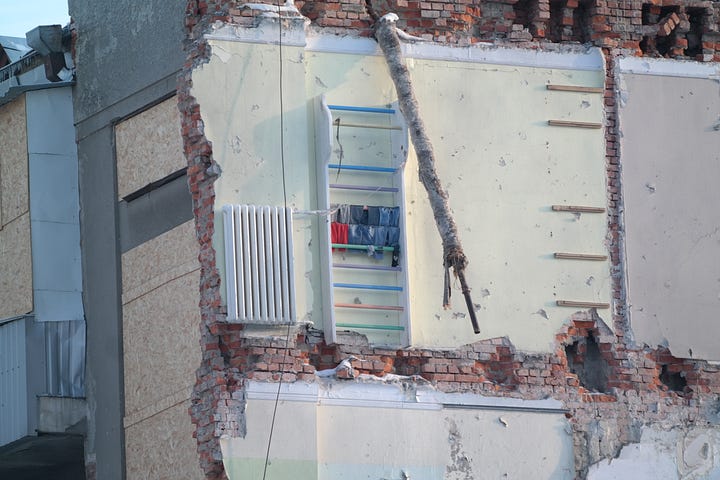 A lot of the damage to Kharkiv took place in 2022, in the early days of the full-scale war when the Russians tried to take the city and before the Ukrainians pushed them back. But not all of it. As I mentioned above, the destruction of the daycare center near the cathedral happened only in October. And an attack downtown that obliterated this building happened only two weeks ago—recently enough that laundry is still hanging in one portion of the building: