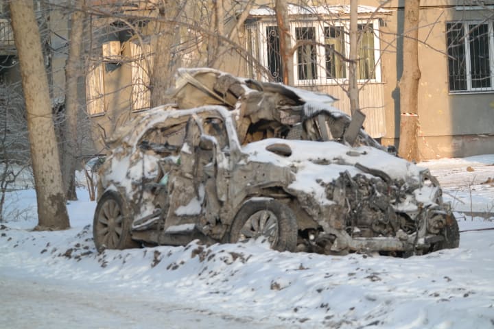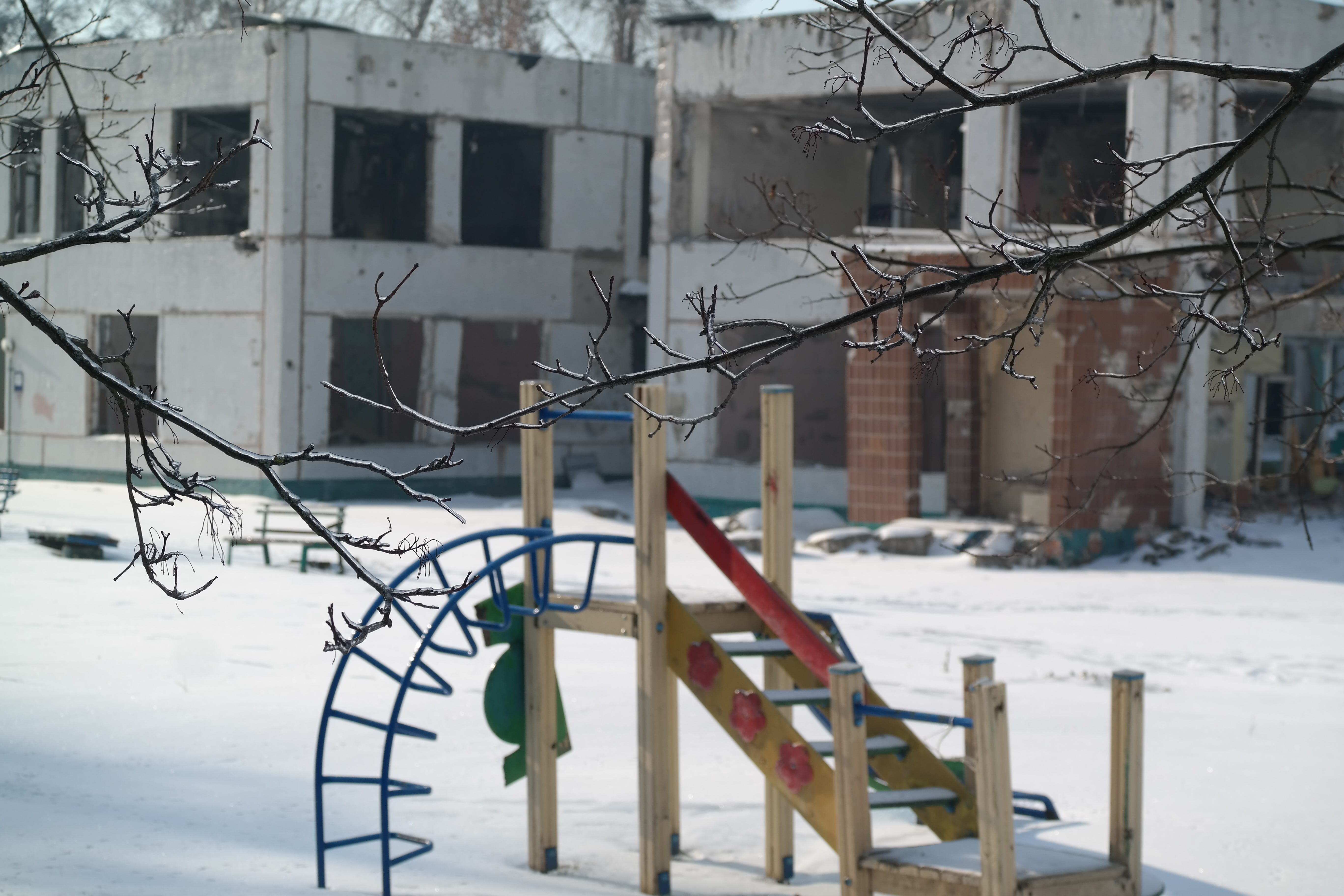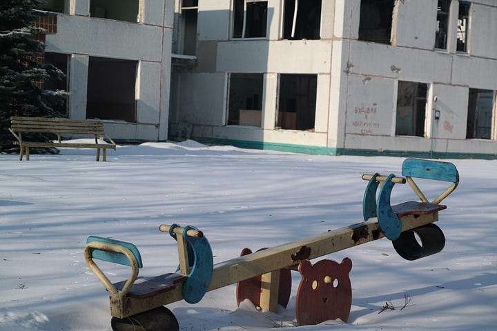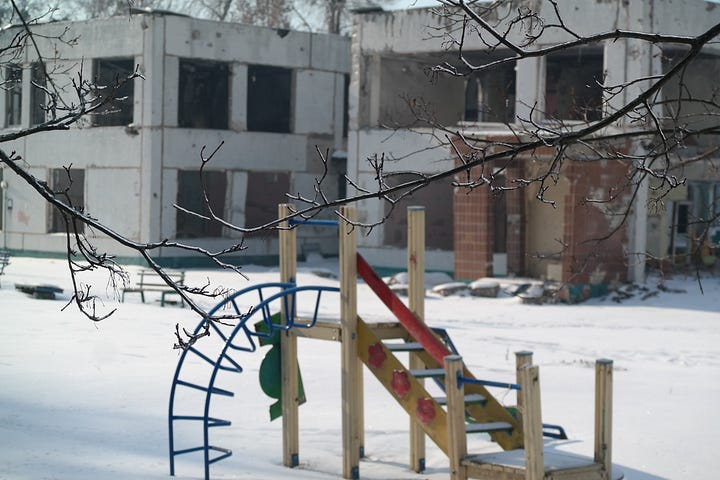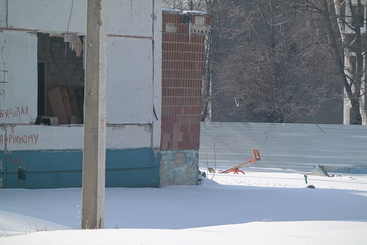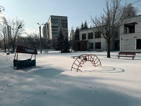 Speaking of kids playing, once you notice the remnants of childhood playthings in a city like Kharkiv, you start seeing them everywhere. Within a few hours of being in the city, I became particularly interested in taking pictures of playground equipment at sites of rocket and drone attacks. Here are some of them:
