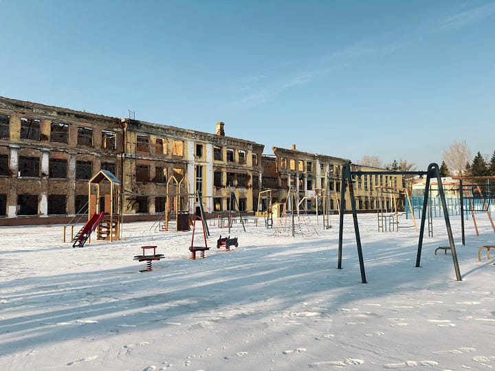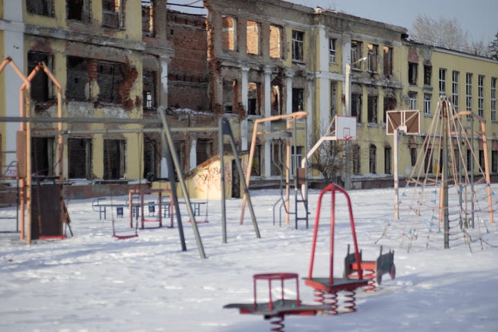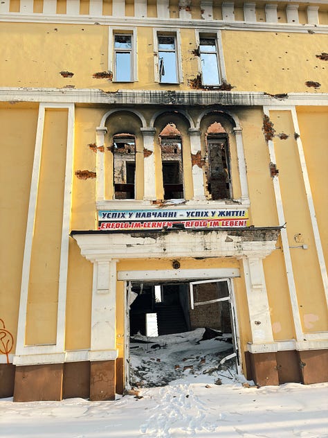 Or a school remarkably close to the center of town, where around 20 Russian soldiers holed up and refused to surrender during the attempt to take the city in 2022 and where a sign above the front entrance still cheerfully greets students in both Ukrainian and—incongruously—German—with the words, “Success in study is success in life!”