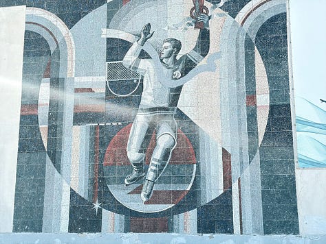Sometimes it’s a lot more than that—like a sports complex completely destroyed with only old Soviet mosaics still surviving: