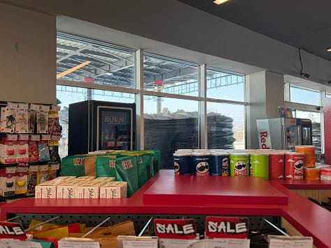 So there are sandbags protecting the windows at a gas station, which—as you can see from the damage to the station—has good reason to have them stacked up by the windows. But the sandbags do make the gas station a relatively good spot to have a Zoom meeting next to a window: