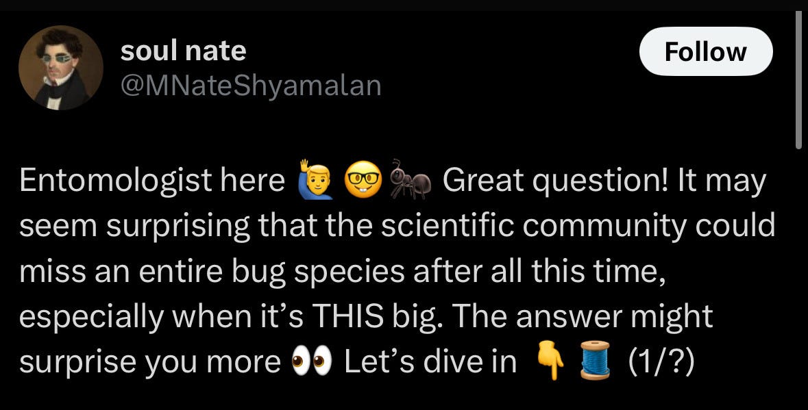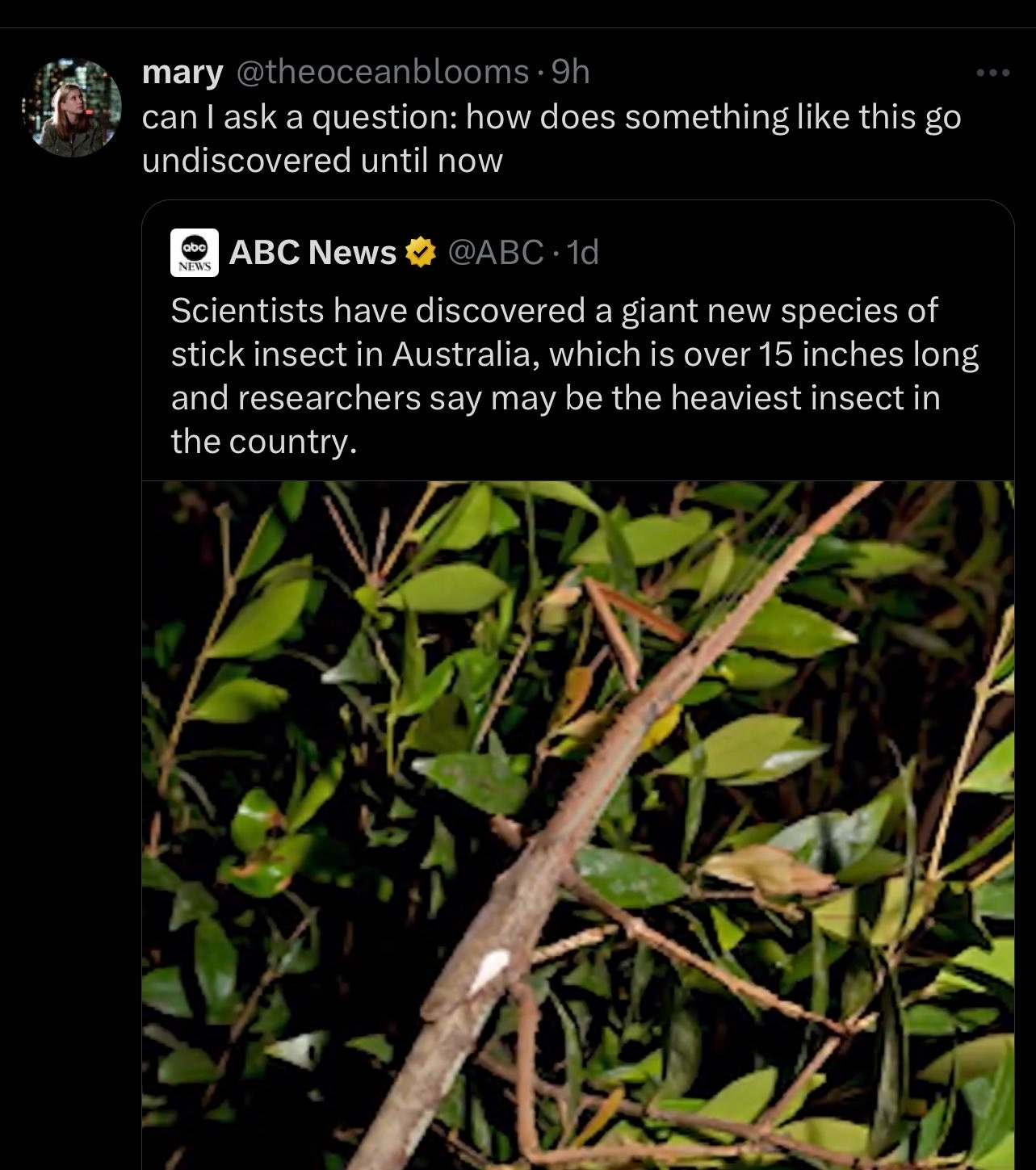 Today’s #BeastOfTheDay is a newly discovered Australian giant stick insect, which you can learn more about here, but which is being honored today for having inspired the following exchange on twitter: