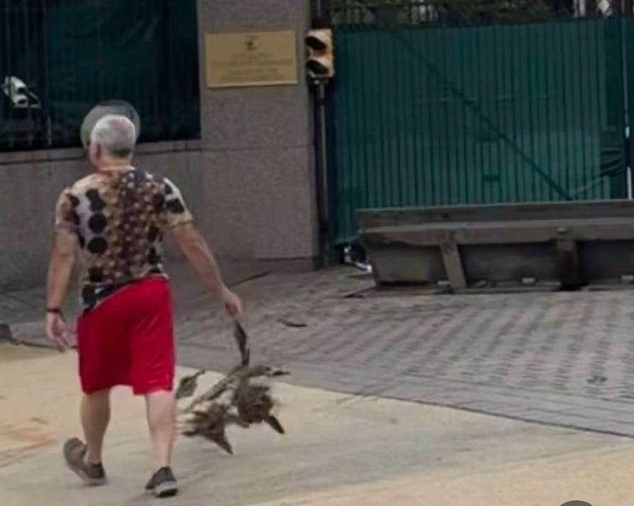 All you have to do is pull one out of the ground—which is easy—walk across the street, and drop the sunflower on the sidewalk in front of the embassy. The worst that happens is someone makes you pick it up or gives you a ticket for littering. Please get someone to film you doing this, or take pictures, and post it to social media.