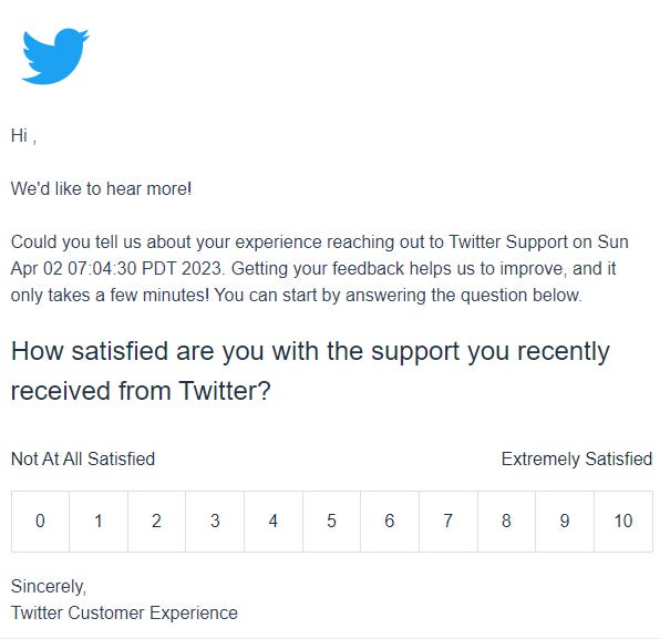 Could I tell you about my experience reaching out to Twitter Support on Sunday, April 2, 2023 at 7:04 PM.
