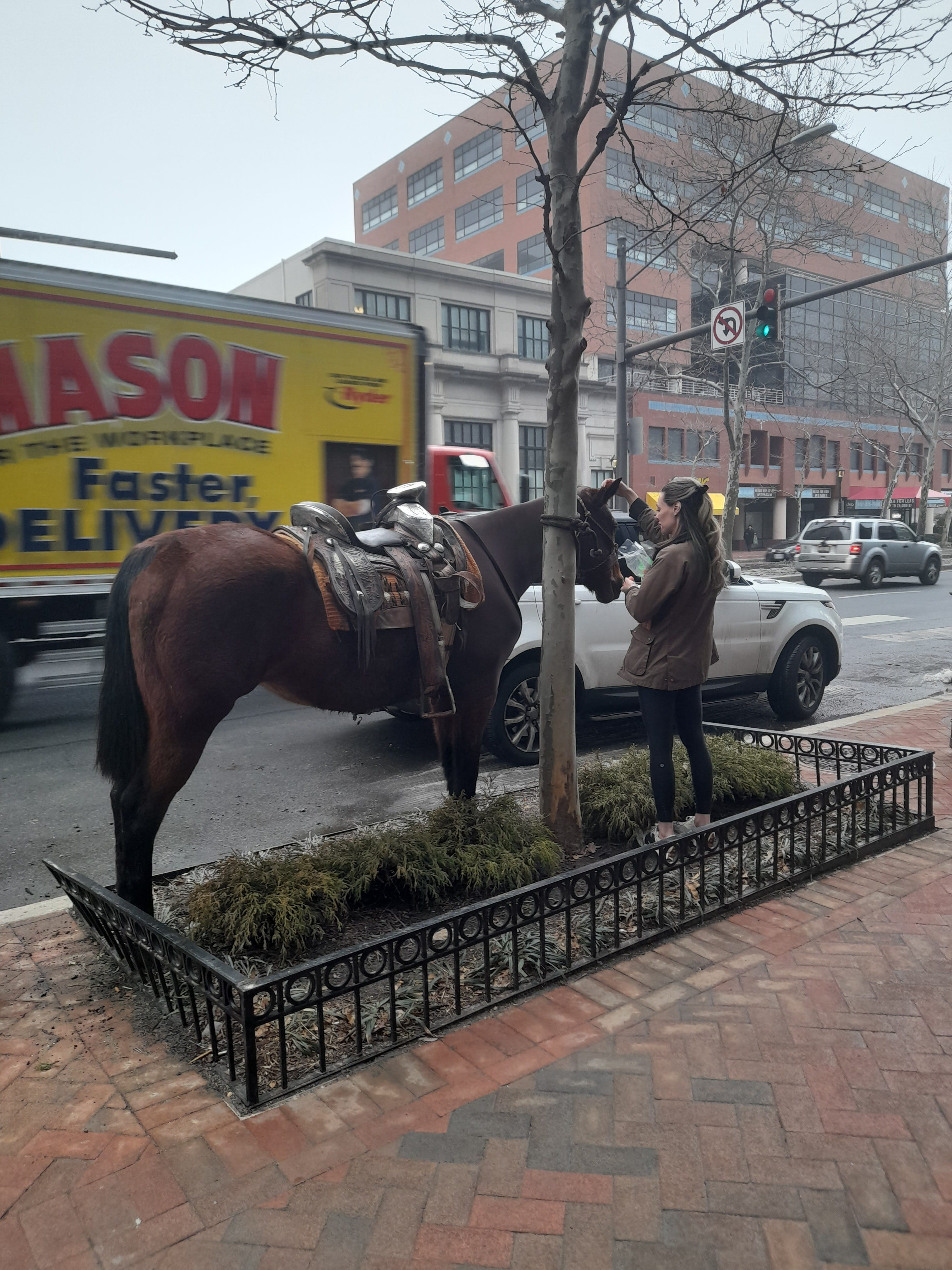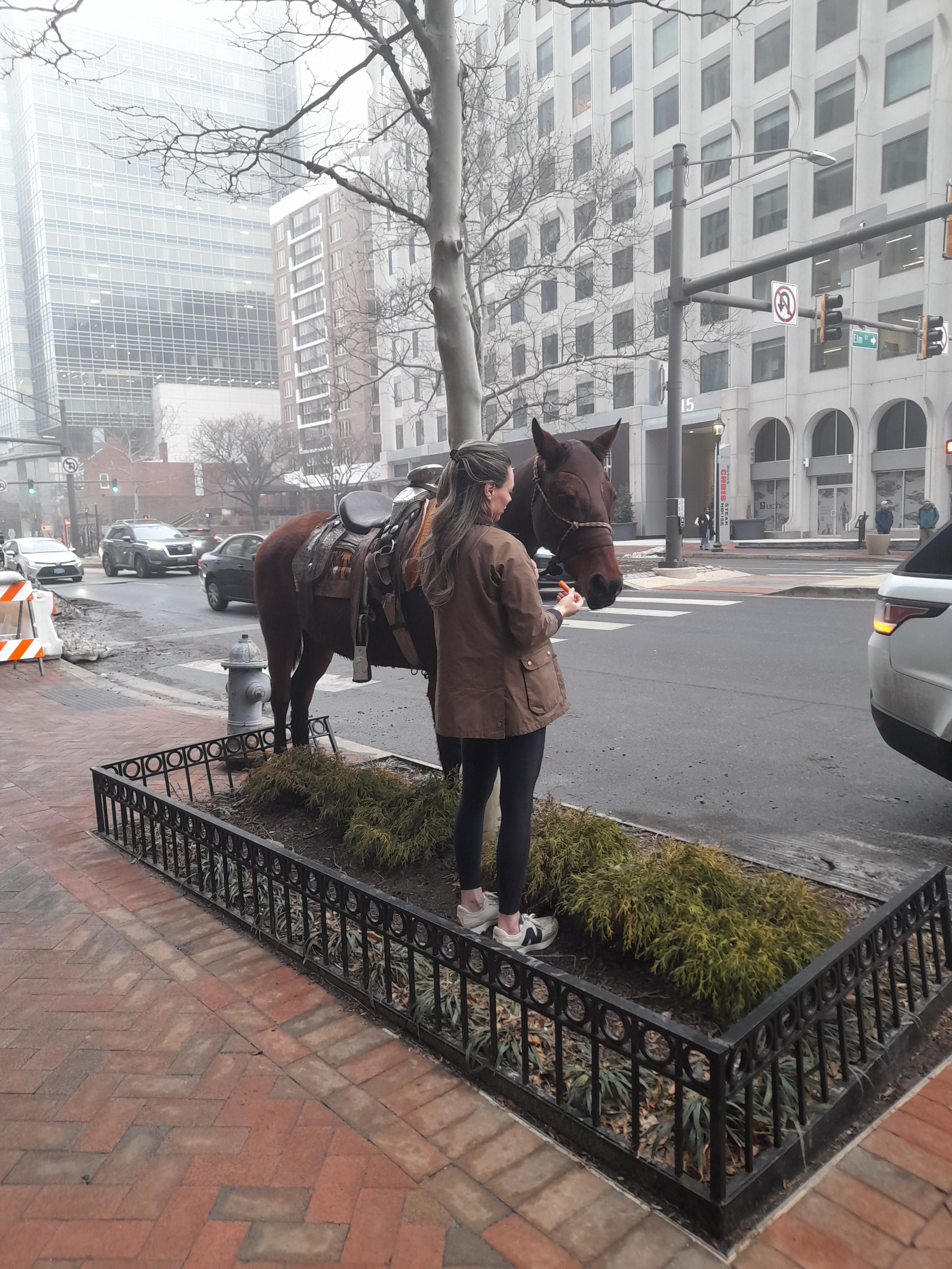 I cannot emphasize to you the extent to which there should not have been a horse outside this coffee shop. This was just outside DC. This is an urban area. This was during rush hour. The woman accompanying the horse was not seemingly equipped for horse riding.