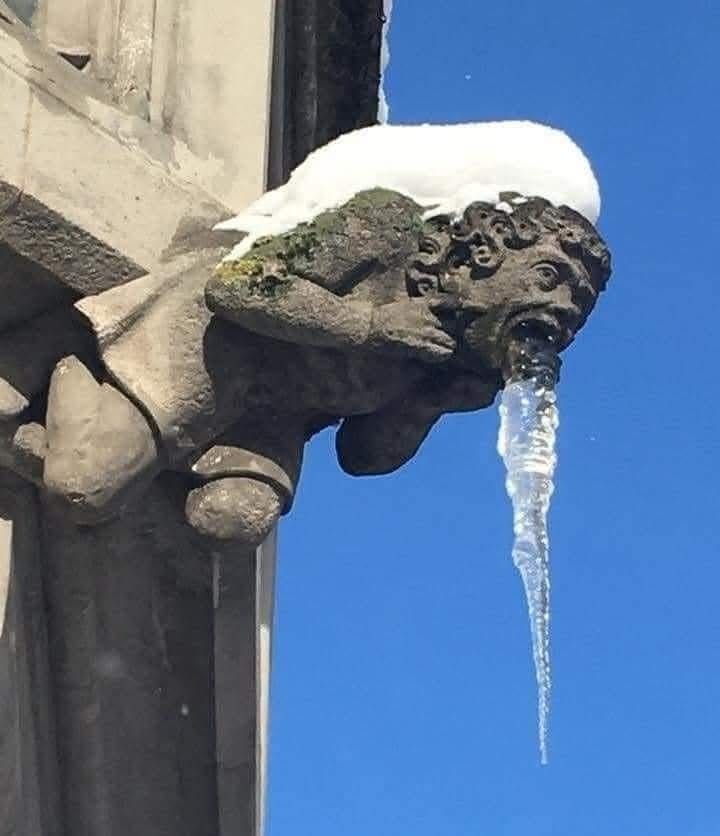 ) the opportunity to share one of my all time favorite pieces of useless but entertaining pedantry:The above image depicts a gargoyle. You can tell that it is a gargoyle because it has water coming out of its mouth. If it did not have an open mouth that functioned to drain water, it would not be a gargoyle. It is in fact the definitional feature of a gargoyle that it, as the OED puts it, “project[s] from the gutter of a building (esp. in Gothic architecture), in order to carry the rainwater clear of the walls.” An ugly stone carving on the outer wall of a building that does not function as a downspout is not a gargoyle; it is merely a grotesque.