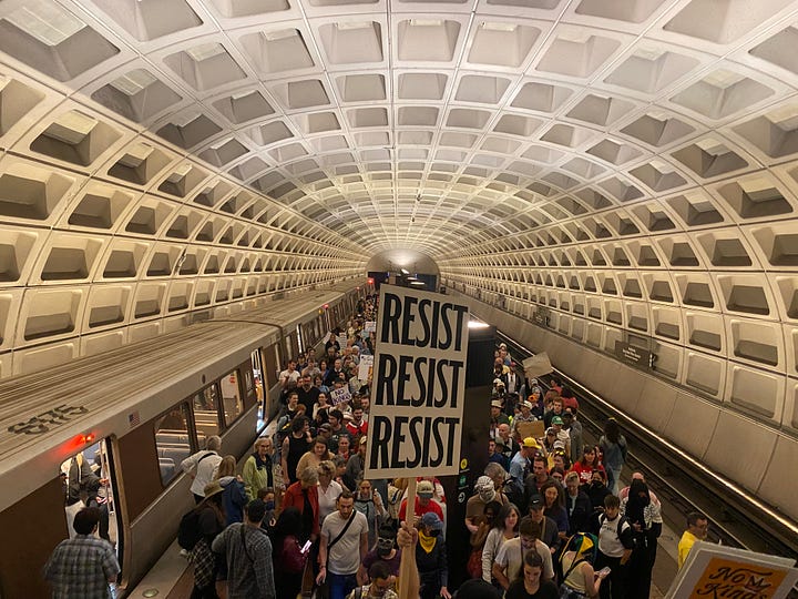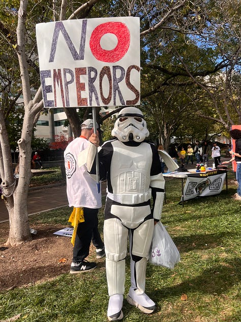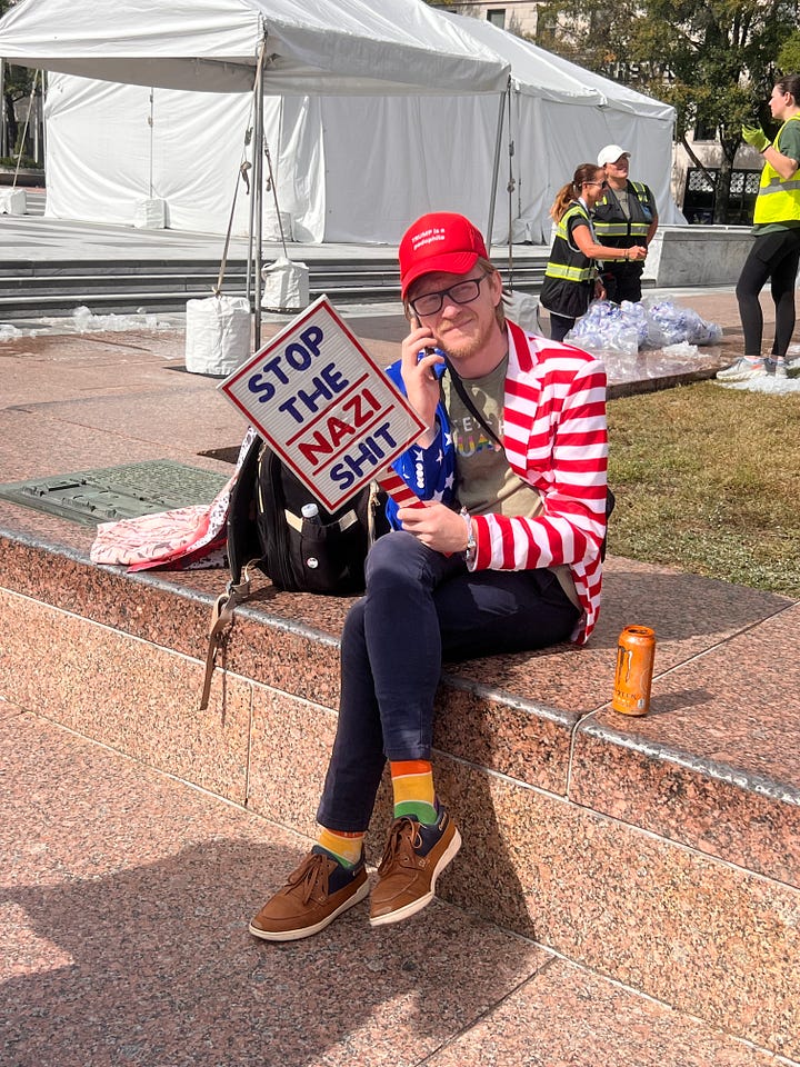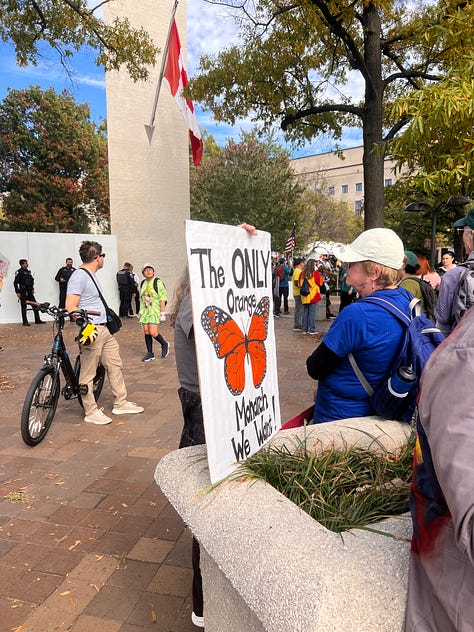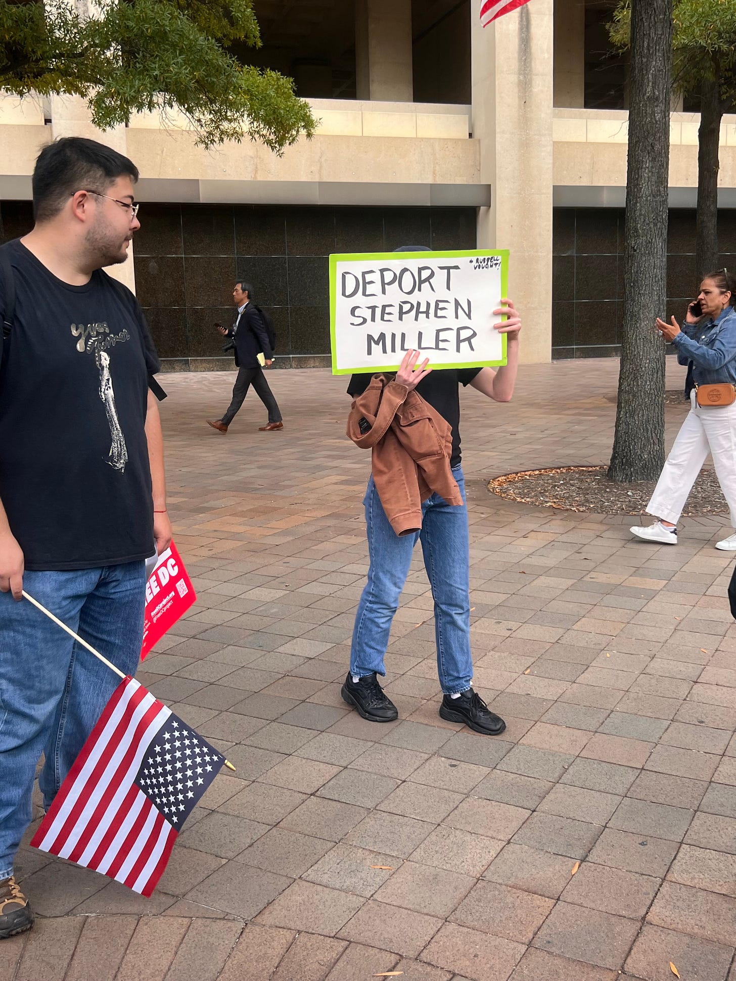 Speaking of sprites of mischief, this one showed up with a similar message at today’s No Kings rally in Washington. She was unaware that her sign was sporting the same message as that of sprites of mischief in his neighborhood or that Miller’s home was on the market. She also didn’t want her face photographed. But she appeared delighted to hear of the company she was keeping.